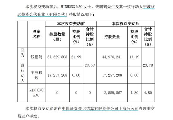 本次权益变动后,钱鹏鹤持有移远通信股份约4497万股,持股比例为17.19%;宁波移远持股不变;钱鹏鹤与宁波移远合计持有移远通信6223万股股份,合计持股比例下降至23.78%。